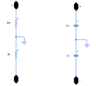 Equivalent model - PWM-controlledor you set the Switching device parameter toAveraged Switch, you must add a mid-point ground system on the DC side. This figure shows how to build a mid-point ground system with either two resistors or two capacitors.
