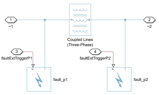 To model a fault in the Coupled Lines (Three-Phase) block, in the Faults section, click Add fault next to the fault that you want to model. For more information about fault modeling, see Fault Behavior Modeling and Fault Triggering.