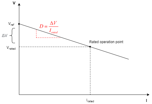The voltage droop, D, is the slope of the line, where Irated=PratedVrated and Vrated=Vref_droopΔV.