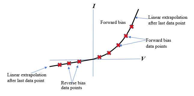If the voltage is between -1 V and 0 V, the block uses makima interpolation so that the I-V curves for forward and reverse bias overlap smoothly.
