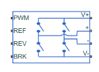 PWM— The H-Bridge block output is a controlled voltage that depends on the input signal at the PWM port. If the input signal has a value greater than the Enable threshold voltage parameter value, the H-Bridge block output is on and has a value equal to the value of the Output voltage amplitude parameter. If it has a value less than the Enable threshold voltage parameter value, the block maintains the load circuit using one of the following three Freewheeling mode options:Via one semiconductor switch and one freewheeling diodeVia two freewheeling diodesVia two semiconductor switches and one freewheeling diode