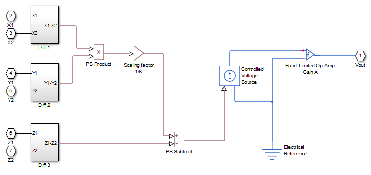 The next figure shows one of the differential subsystem blocks. All three differential subsystem blocks are identical in structure.