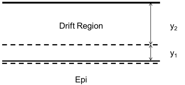In the figure, the top solid line is the semiconductor surface. The lower solid line is the junction between the drift region and the epi layer. The dashed lines show the extent of the space-charge region around the drift-epi interface. λD is y1/y2 at zero bias.