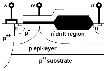 The channel region is in the p+ region, from the heavily n-doped source well to the end of the p+ region. The drift region is a lightly doped drain extension. Further down, there is a p-type epi-layer, and then the entire structure is on a heavily p-doped substrate. The gate oxide is thin over the entire channel region and over part of the drift region. Further into the drift region, the gate oxide has a greater thickness in the local-oxidation-of-silicon (LOCOS) region.