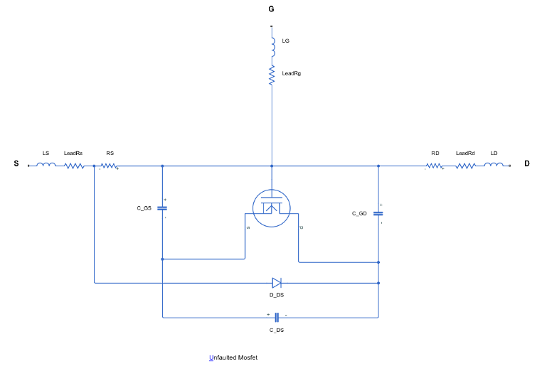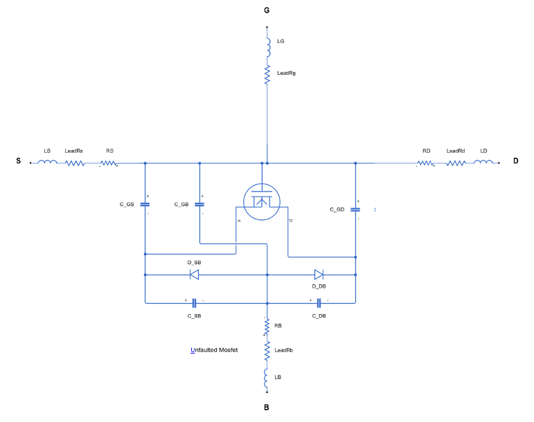 These figures show the equivalent circuits for the four-terminal MOSFET in the unfaulted and faulted state: