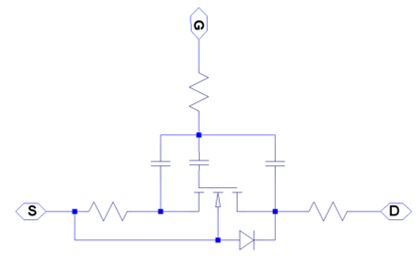 For the four terminals parameterization, the Input capacitance, Ciss, Reverse transfer capacitance, Crss, and Output capacitance, Coss are obtained using these equations: