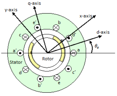 ia, ib, ic, id, and ie are the currents flowing in the stator windings.