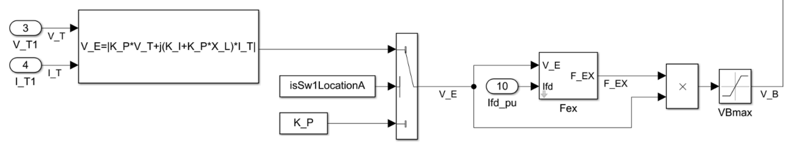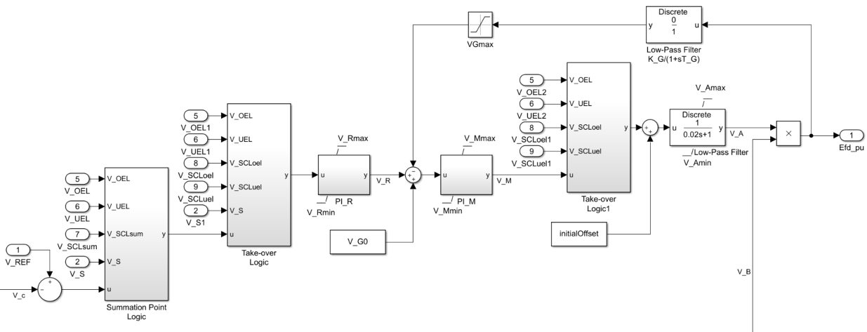 An inner field voltage control loop is utilized to linearize the exciter control characteristic and it is composed of the gains KM and KG and the time constants TM and TG. The minimum and maximum anti-windup saturation limits for the Low-Pass Filter block are VAmin and VAmax, respectively.