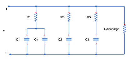 Capacitors C1, C2, and C3 have fixed capacitances. The capacitance of capacitor Cv depends on the voltage across it. Resistors R1, R2, and R3 have fixed resistances. The voltage across each individual fixed capacitor in the Supercapacitor block is calculated as