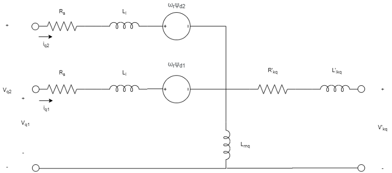 The equivalent circuits of the six-phase synchronous machine for the direct axis, the quadrature axis, and the two zero sequence are: