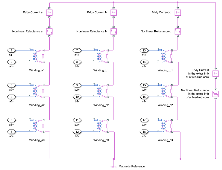 This block is implemented in the magnetic domain using basic magnetic reluctances, windings, and eddy currents blocks.