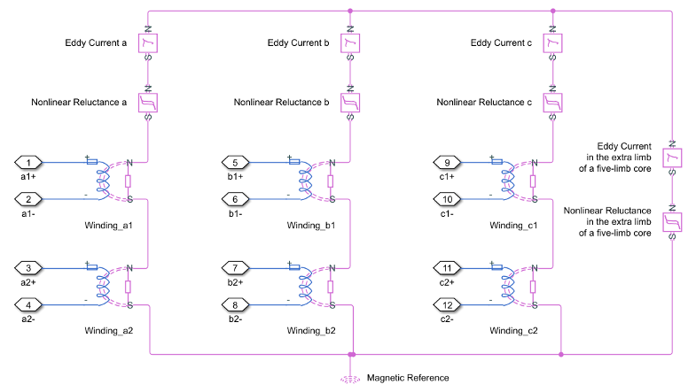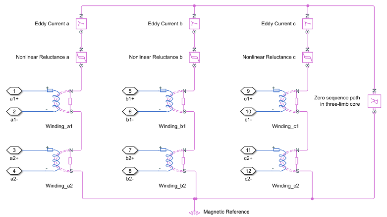 This block is implemented in the magnetic domain using basic magnetic reluctances, windings, and eddy currents blocks.