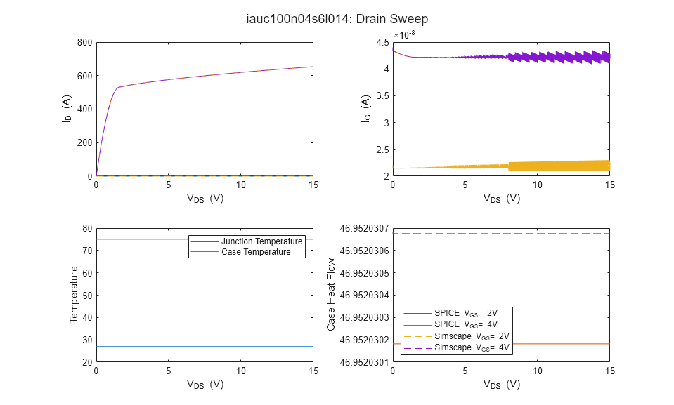 This example shows how to convert a metal-oxide-semiconductor field-effect transistor (MOSFET) subcircuit into an equivalent Simscape™ component and compare the Spice and Simscape plots for some standard MOSFET characteristics, namely Id versus Vgs, Id versus Vds, Qiss/ Gate charge, Qoss/ Output charge, and Breakdown voltage. The subcircuit2ssc function converts all the subcircuit components inside a SPICE netlist file into one or more equivalent Simscape files.