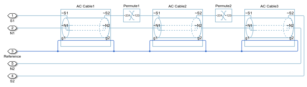 The figure shows the cable model comprised of three pi-sections with cross-bonded sheaths. The sheath cross-bonding is implemented using Phase Permute blocks.