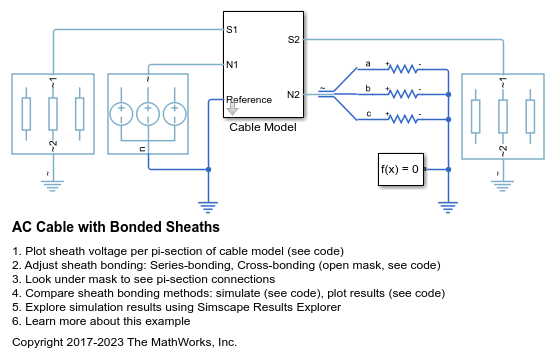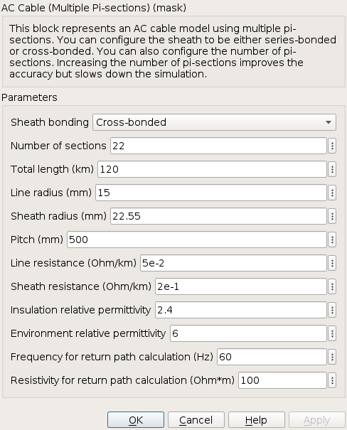 This example shows a three-phase cable model comprised of multiple pi-sections. Each phase is enclosed in a conductive sheath. The conductive sheath is connected to ground at either end of the cable through a simple resistance. A high-voltage source provides power to an unbalanced resistive load through the power cable. You can configure the sheath to be either series-bonded or cross-bonded. You can also configure the number of pi-sections. Increasing the number of pi-sections improves the accuracy but slows down the simulation. To facilitate convergence, the voltage source includes an internal impedance.