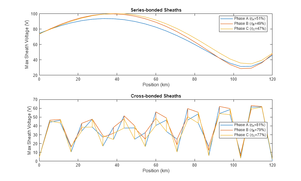 The plots show the behavior of the sheath bonding methods for a cable model comprised of 22 pi-sections. The efficiency with cross-bonded sheaths is higher than the efficiency with series-bonded sheaths.