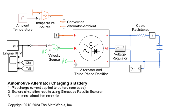 This example shows how alternator behavior can be abstracted to a DC model that simulates efficiently. This test harness first ramps the alternator speed linearly from zero to a typical idle speed of 900 RPM. When the generated voltage is sufficient to overcome the forward voltage drop associated with the rectifier diodes, the battery charging current starts to ramp up. The test harness then ramps up the speed to 5000 RPM, and the alternator has to back off the field voltage to maintain the regulated voltage. The model captures the increase in stator resistance as the alternator heats up, this reducing device performance