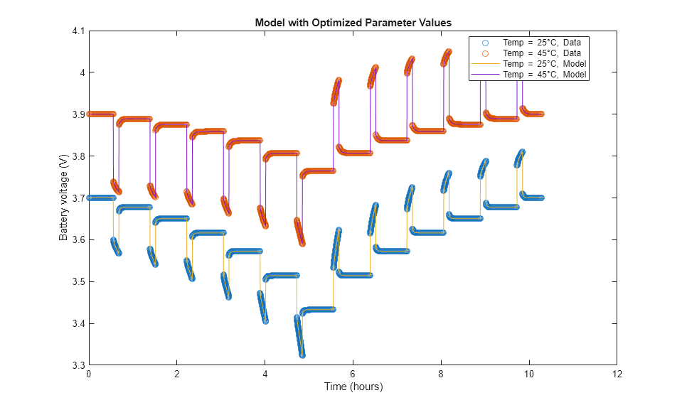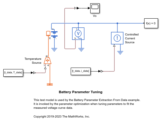 This example shows optimization of the Battery block's parameters to fit data defined over different temperatures. It uses the MATLAB® optimization function fminsearch. Other products available for performing this type of parameter fitting with Simscape™ Electrical™ models are the Optimization Toolbox™ and Simulink® Design Optimization™. These products provide predefined functions to manipulate and analyze blocks using GUIs or a command line approach.