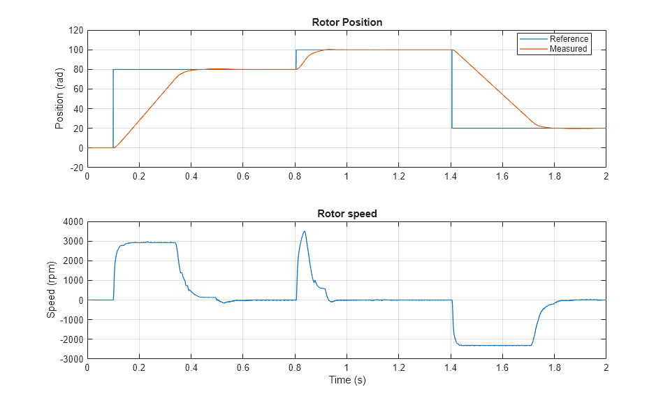 The plot below shows the requested and measured angle for the test and the rotor speed in the electric drive.
