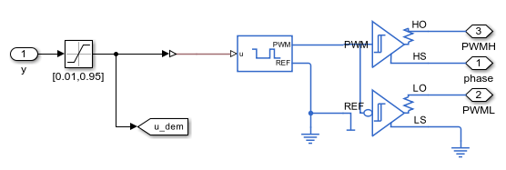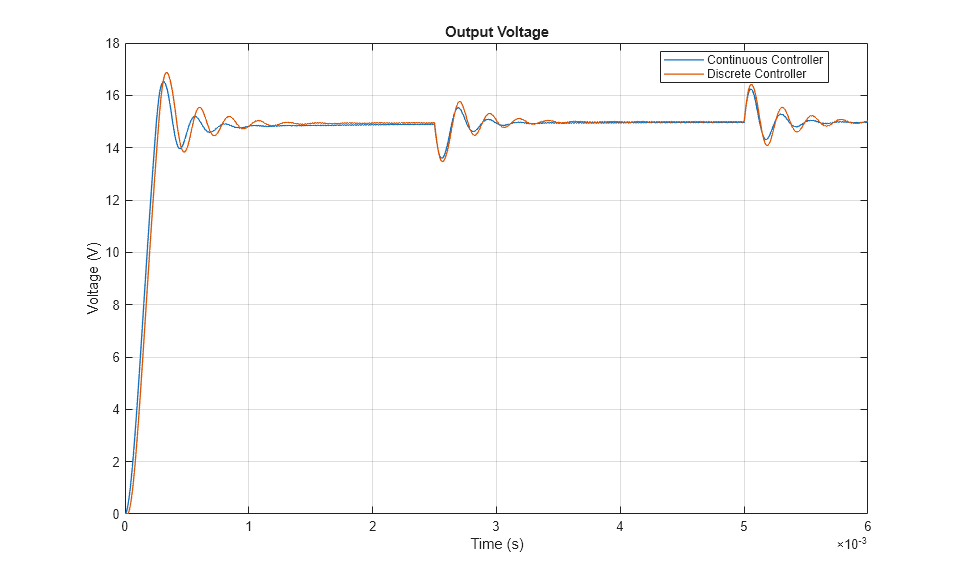 This example shows how to model a switching power supply that converts a 30V DC supply into a regulated 15V DC supply. The model can be used to both size the inductance L and smoothing capacitor C, as well as to design the feedback controller. By selecting between continuous and discrete controllers, the impact of discretization can be explored. Modeling the switching devices as MOSFETs rather than ideal switches ensures that device on-resistances are correctly represented. The model also captures the switch-on/switch-off timing of the devices, this depending primarily on the gate capacitance values and the PWM driver output resistance.