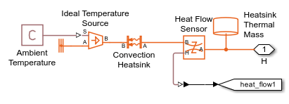 The MOSFETs are configured to show thermal ports, these being connected to subsystems modeling the heatsinks and environment. The total heat flow is calculated and shown by Scope 3. For an abstracted model of the thermal dynamics only, see the Buck Converter Thermal Model example. The abstracted model is used to determine initial temperatures for this model. Diode thermal ports are not exposed as their thermal contribution is very small compared to that of the MOSFETs