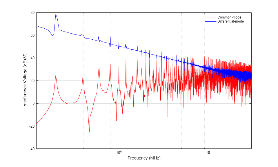The plot below shows the common- and differential-mode noise for a buck converter operating at a switching frequency of 200kHz.