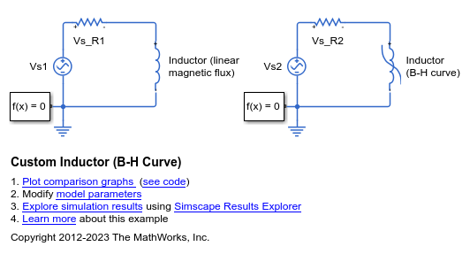 This example shows a comparison in behavior of a linear and nonlinear inductor. Starting with fundamental parameter values, the parameters for linear and nonlinear representations are derived. These parameters are then used in a Simscape™ model and the simulation outputs compared.
