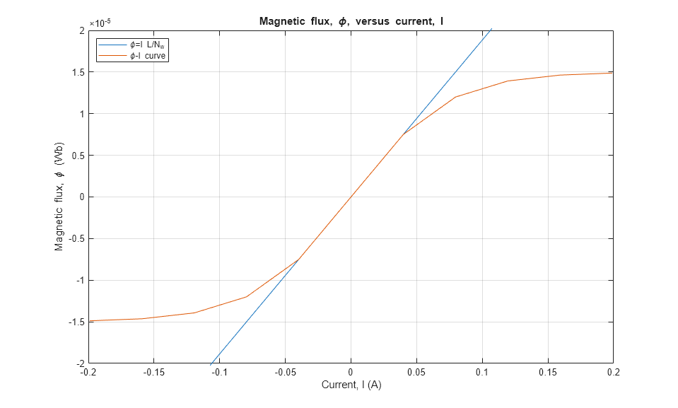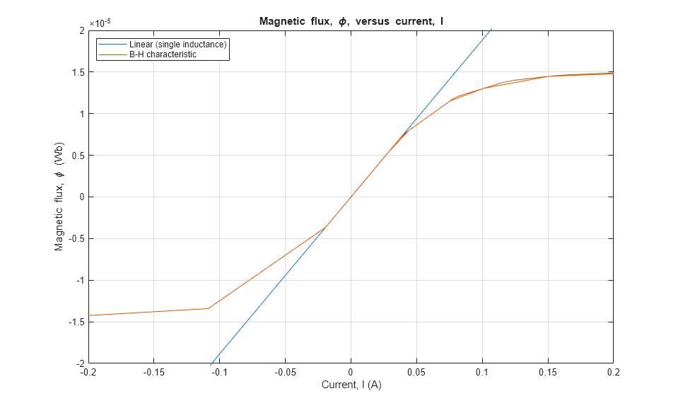 The state variable for both representations is magnetic flux, $\phi$. Current, I, and magnetic flux, $\phi$, can be obtained from the Simscape logging variable, simlog_CustomInductorBHCurve, for each representation. Overlaying the simulation results from the representations permits direct comparison.