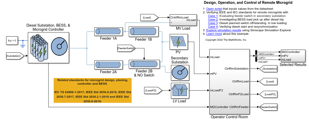 This example shows how to develop, evaluate, and operate a remote microgrid. You also evaluate the microgrid and controller operations against various standards, including IEEE® Std 2030.9-2019, IEC TS 62898-1:2017 and IEEE Std 2030.7-2017. The planning objectives in the design of the remote microgrid include power reliability, renewable power usage, and reduction in diesel consumption. The key indices for economic benefits for the remote microgrid include life-cycle cost, net revenue, payback period, and internal rate of return. You can download this model in MATLAB® or access it from MATLAB Central File Exchange and GitHub®.