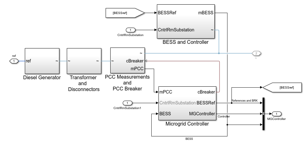 Look under the mask of the Diesel Substation, BESS, & Microgrid Controller subsystem. This subsystem connects the diesel generator to the microgrid through the transformer and disconnectors. The PCC Measurements and PCC Breaker subsystem models the measurements at the PCC. The BESS and Controller subsystem comprises the battery modules and the grid-side converter, filter, measurement system, and control system. The Microgrid Controller subsystem implements the microgrid controller functions.