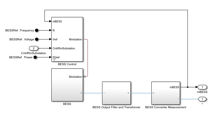 Inside the Diesel Substation, BESS, & Microgrid Controller subsystem, look under the mask of the Bess and Controller subsystem. The BESS subsystem implements the BESS module and the BESS converter. The converter connects the battery modules to the grid and controls the power flow through the converter. The BESS Control subsystem regulates the voltage and the frequency based on the voltage and frequency references it receives from the microgrid controller. The BESS Output Filter and Transformer subsystem models the BESS filter and transformer. The BESS Converter Measurement subsystem measures the BESS output power, voltage, and current.