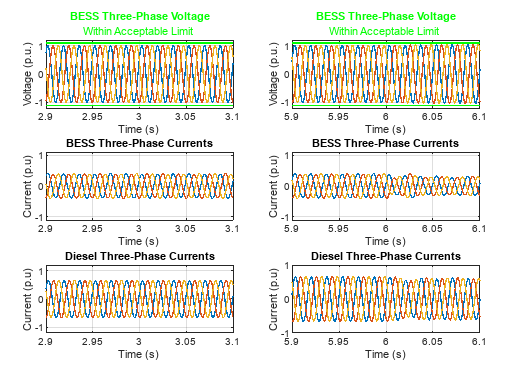 This plot shows the three-phase voltage and current output of the BESS and the diesel current. At 3 seconds, the upper feeder disconnects and the lower feeder connects to the LV load. At 6 seconds, part of the LV load disconnects as well. The stable voltage output and current output from the BESS verify a stable control during the switching process. At the MATLAB Command Window, run: