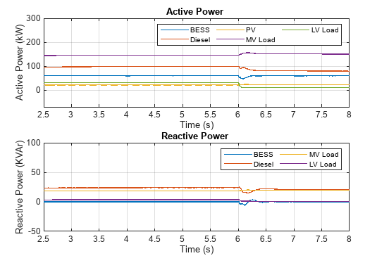 This plot shows the active and reactive power of BESS, diesel, PV, and loads. The stable active power output and reactive power output verify the efficacy of the control methods and microgrid operations. At the MATLAB Command Window, run: