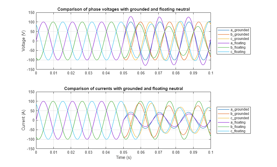 Up to 0.05 seconds, there is no difference in phase voltages and phase currents between the conditions of the grounded neutral and floating neutral. At 0.05 seconds, the load becomes unbalanced, and the current flowing through the load changes for both conditions. However, the phase voltage in the case of neutral grounding remains constant throughout the simulation because the load is effectively grounded, unaffected by the unbalancing of the three-phase load.