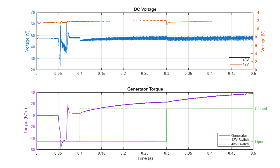 This example shows an interior permanent magnet synchronous machine (IPMSM) used as a starter/generator in a simplified 48V automotive system. The system contains a 48V electric network and a 12V electric network. The internal combustion engine (ICE) is represented by basic mechanical blocks. The IPMSM operates as a motor until the ICE reaches the idle speed and then it operates as a generator. The IPMSM supplies power to the 48V network, which contains the R3 power consumer. The 48V network supplies power to the 12V network which has two consumers: R1 and R2. The total simulation time (t) is 0.5 seconds. At t = 0.05 seconds, the ICE turns on. At t = 0.1 seconds, R3 switches on. At t = 0.3 seconds, R2 switches on and increases the load on the 12V electric network. The EM Controller subsystem includes a multi-rate PI-based cascade control structure which has an outer voltage-control loop and two inner current-control loops. The task scheduling in the Control subsystem is implemented as a Stateflow® state machine. The DCDC Controller subsystem implements a simple PI controller for the DC-DC Buck converter, which feeds the 12V network. The Scopes subsystem contains scopes that allow you to see the simulation results.