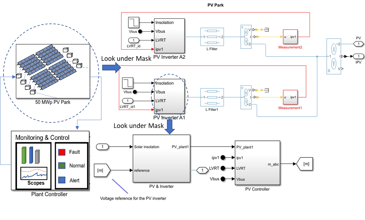 Inside the BESS & PV PARK subsystem, look under the mask of the 50 MWp PV Park subsystem. This subsystem models the PV plant. The PV plant comprises of two three-phase central inverters. Each PV inverter can deliver a maximum power of 50 MW at a temperature of 25 and solar insolation of 1000 . A 4.16 / 24.9 kV distribution transformer connects the PV inverters to a medium voltage power network. The PV inverter operates at its maximum power point (MPP).