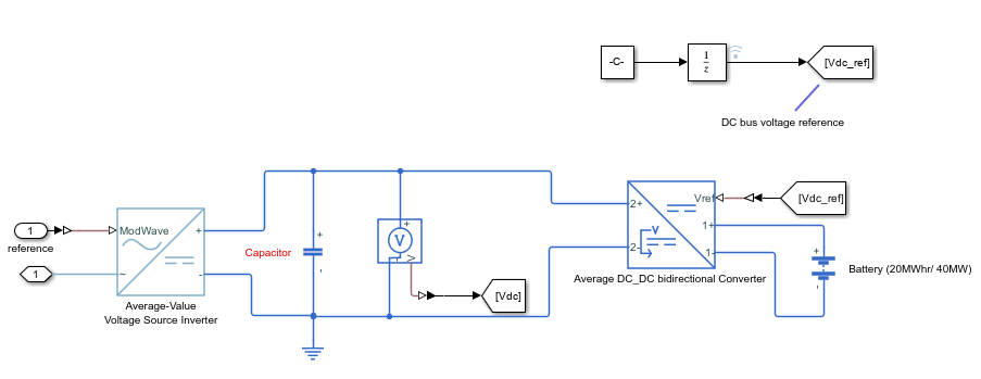 The BESS comprises a grid-scale battery unit that has a storage capacity of 60 MWhr with a maximum power of 35 MW. The BESS system integrates into the network through a two-stage power conversion process. The first stage of the power conversion process is a bidirectional DC-DC converter that maintains the battery DC link voltage. The second stage is the grid-side inverter, which controls the power flow between the BESS and the grid.