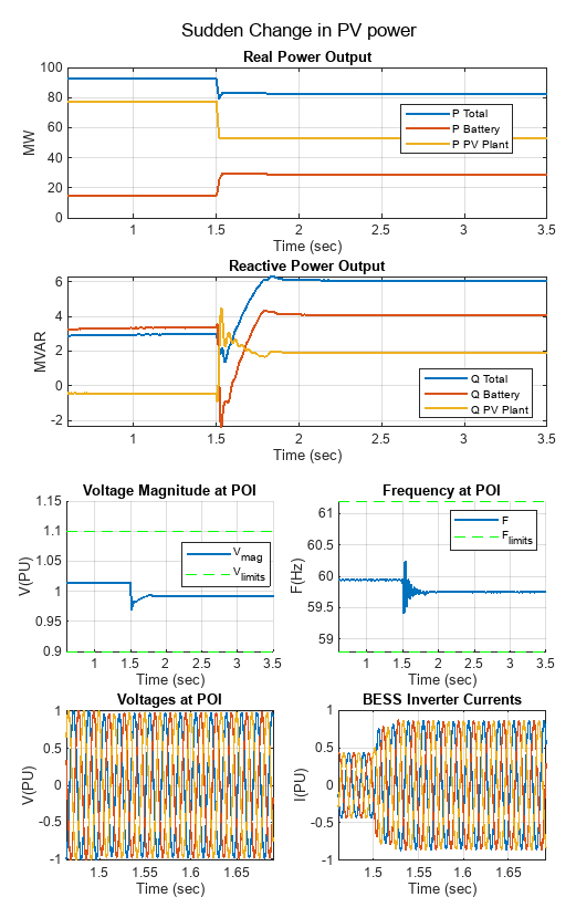 This figure shows the performance of the BESS unit after a sudden 50% reduction of the PV power output at 1.5 seconds. The BESS with the GFM control responds effectively during the disturbance. The BESS provides the inertial power and the primary response along with required reactive power to maintain stable system operation.