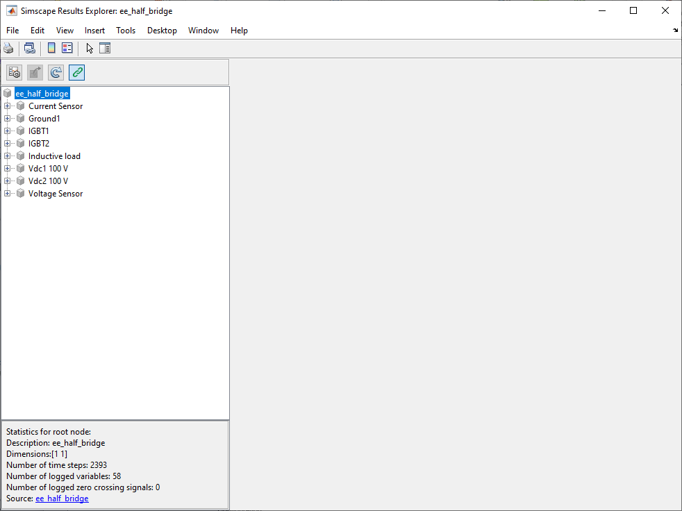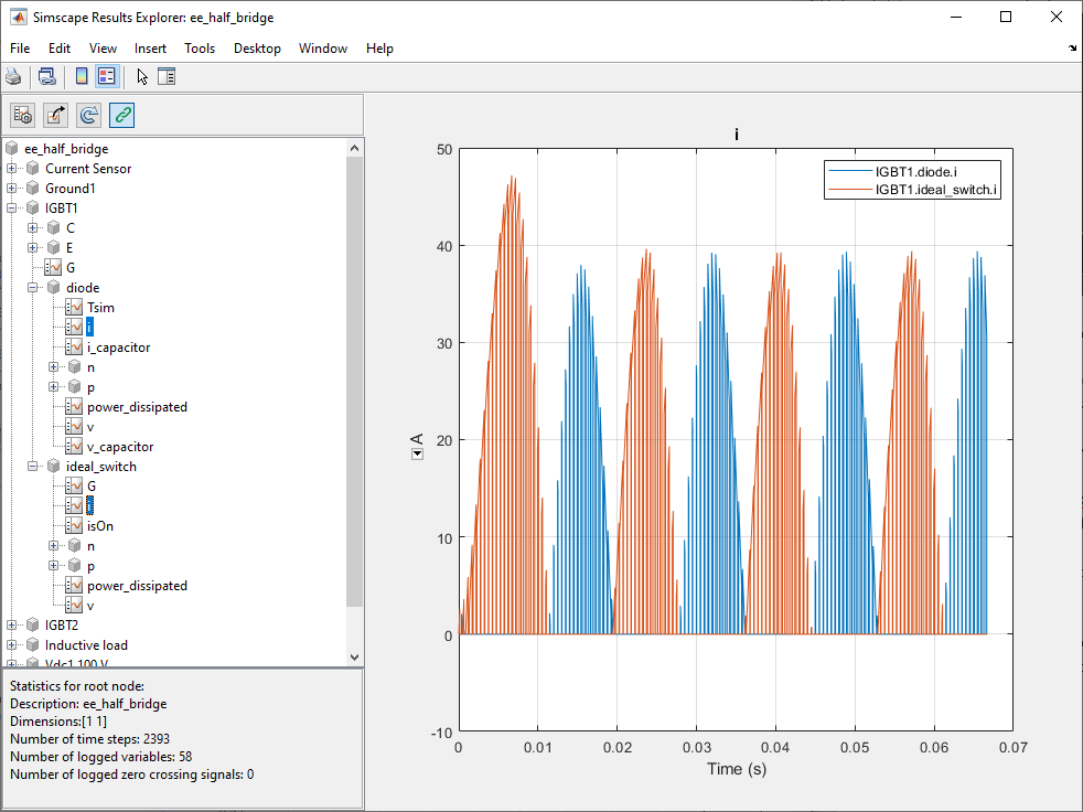 pane. For example, if you click the variable i in IGBT1 > ideal_switch, then the Simscape Results Explorer plots the current that flows through