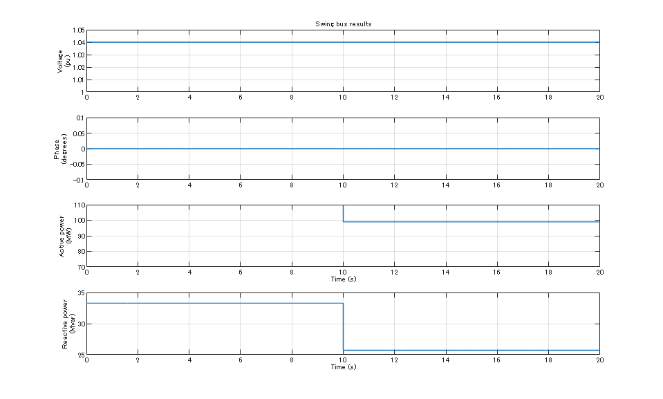 The plot below shows the dynamic response due to adding a 50MW load to Bus 6 half-way through the simulation. The additional active and reactive powers that the swing bus must deliver can be seen.