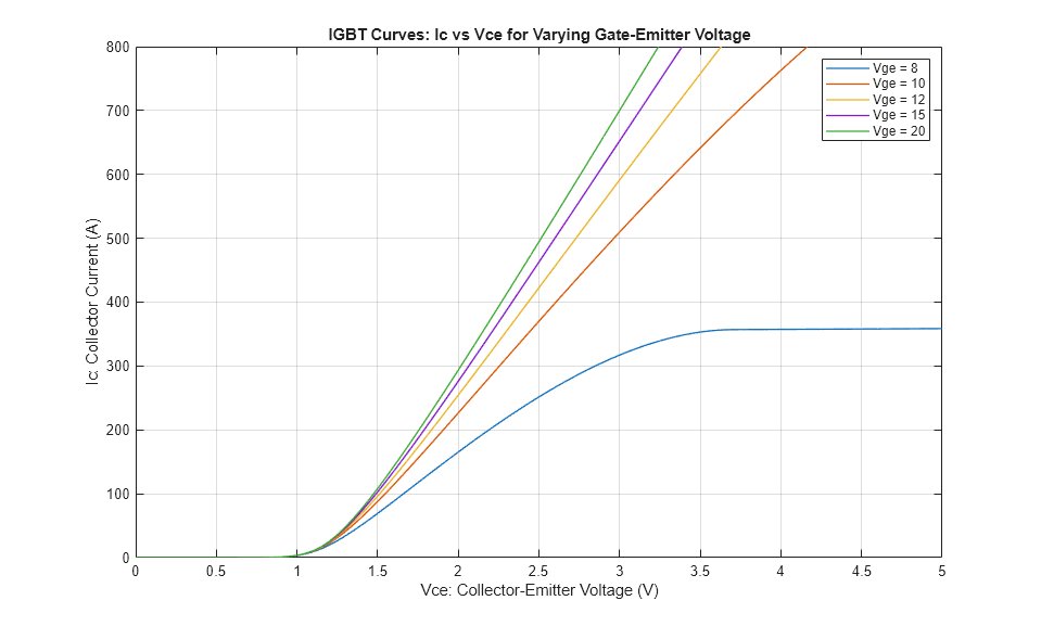 This example shows generation of the Ic versus Vce curve for an insulated gate bipolar transistor. Define the vector of gate-emitter voltages and minimum and maximum collector-emitter voltages by double-clicking the block labeled 'Define Conditions (Vge and Vce)'. Click on the hyperlink 'plot curves' in the model to run the simulations plot the simulation results.