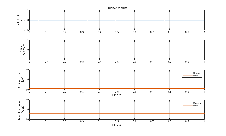 This plot shows the simulation results following the steady state initialization to meet load flow targets. Observe that there is no transient, indicating that the induction motor has been correctly initialized.