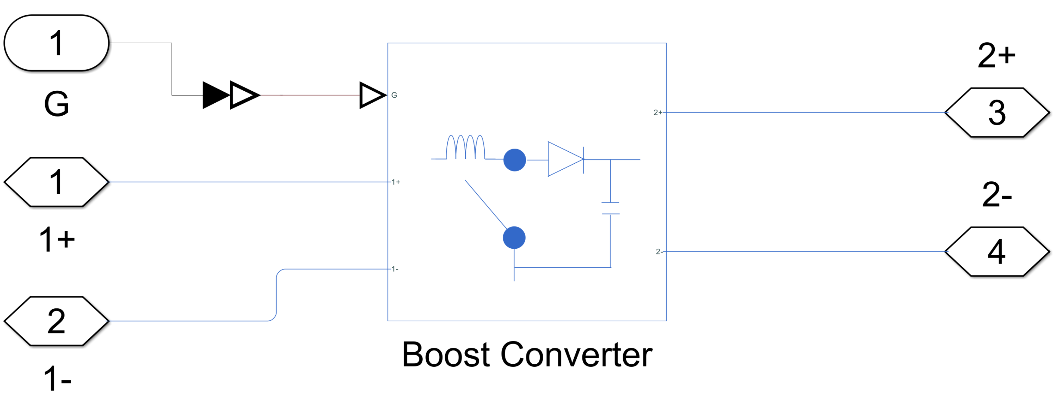 The Ideal switching subsystem is a high-fidelity, piecewise-linear model of the converter. You can use this model for converter-level modeling. To create this model, you can use a Boost Converter block and set the Modeling option parameter to Nonsynchronous converter. Set the Switching device parameter to Ideal semiconductor switch. Then, use PWM Generator and Rate Transition blocks to implement a PWM signal, which you can input to the control signal port G.