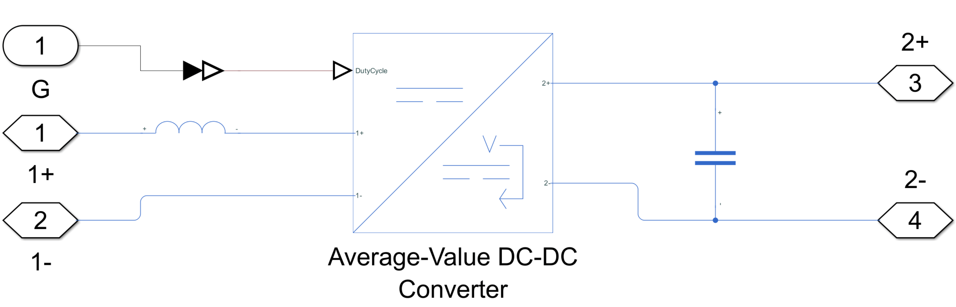 The Average-value with LC subsystem is a low-fidelity model of the converter that includes an inductor and a capacitor. To create this model, you can use an Average-Value DC-DC Converter block and set the Converter type parameter to Boost converter. Then, connect Inductor and Capacitor blocks to the Average-Value DC-DC Converter block. To obtain comparable results to the Average switching model, set the Inductance and Series resistance parameters of the Capacitor block to the values you specify for the Inductance and Inductor series resistance parameters of the Boost Converter block, respectively. Then, set the Capacitance and Series Resistance parameters of the Capacitor block to the values you specify for the Capacitance and Capacitor effective series resistance parameters of the Boost Converter block, respectively.