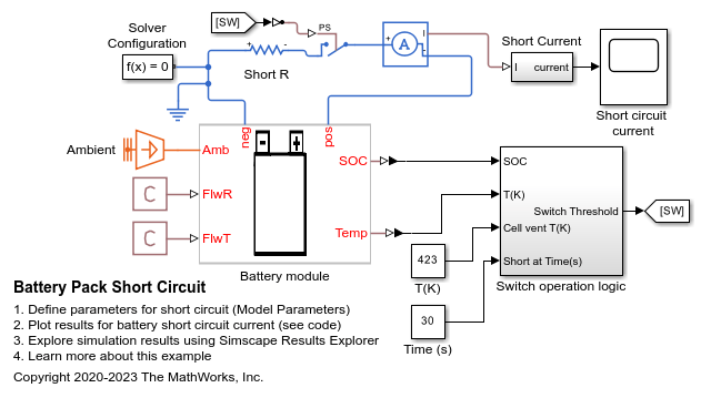 The switch in the circuit is closed at 30s time in the Switch operation logic subsystem. The circuit is completed and short circuits the system through a resistance of 0.1m-Ohm. As a high current passes through all the cells in the module, the cell temperature rises and quickly attains the trigger temperature for thermal runaway and gas venting. The switch is opened to disconnect the electrical circuit as the cell is now dead.