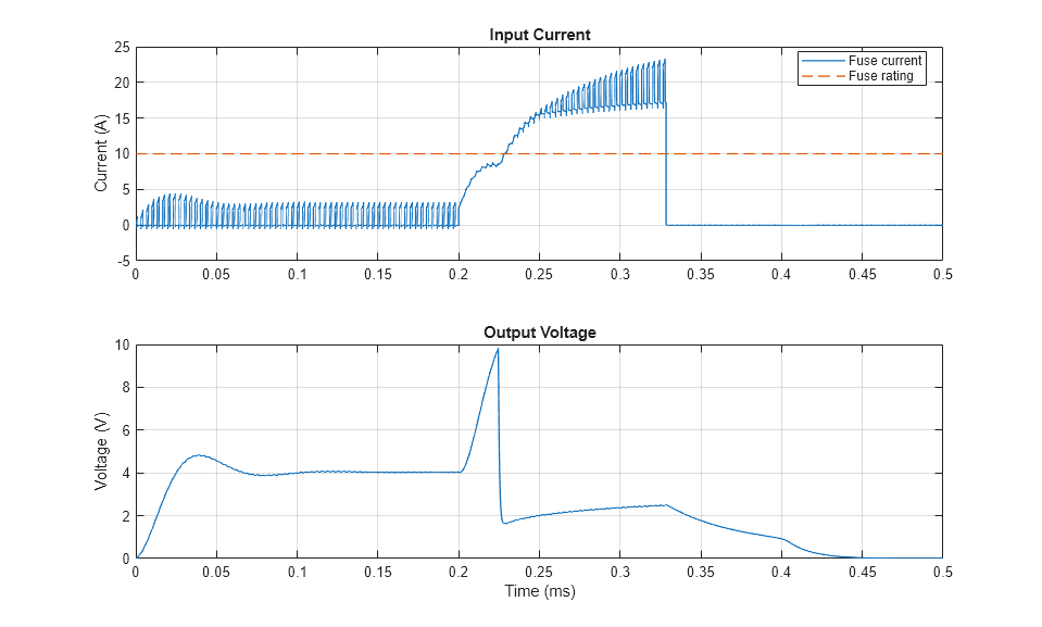 The plot below shows the current passing through the input Fuse and the voltage across the Load resistor.