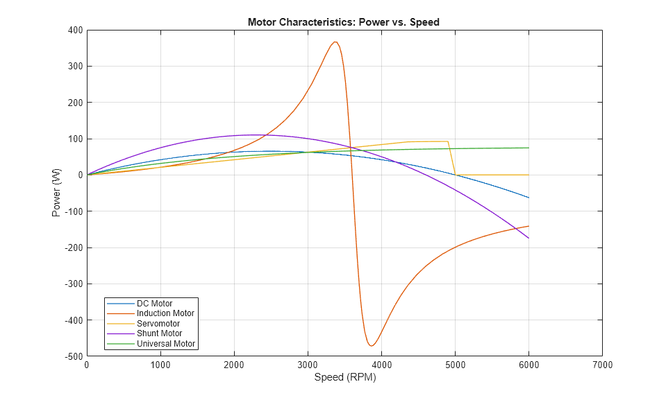 To run and compare all five motors, click on the hyperlink to plot characteristic curves. Understanding the torque-speed and power-speed behavior of a motor is critical when choosing a motor for a given application. Modify this model and its supporting library to compare specific motors based on their datasheet values. Critical parameters are typically starting torque (torque at zero RPM), and peak/maximum power and the corresponding RPM.