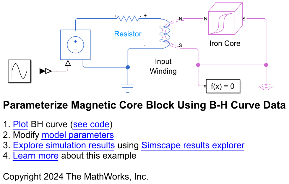 This example shows how to parameterize a Magnetic Core block using B-H curve data. This block represents a magnetic core with magnetic hysteresis implementing a Jiles-Atherton model.