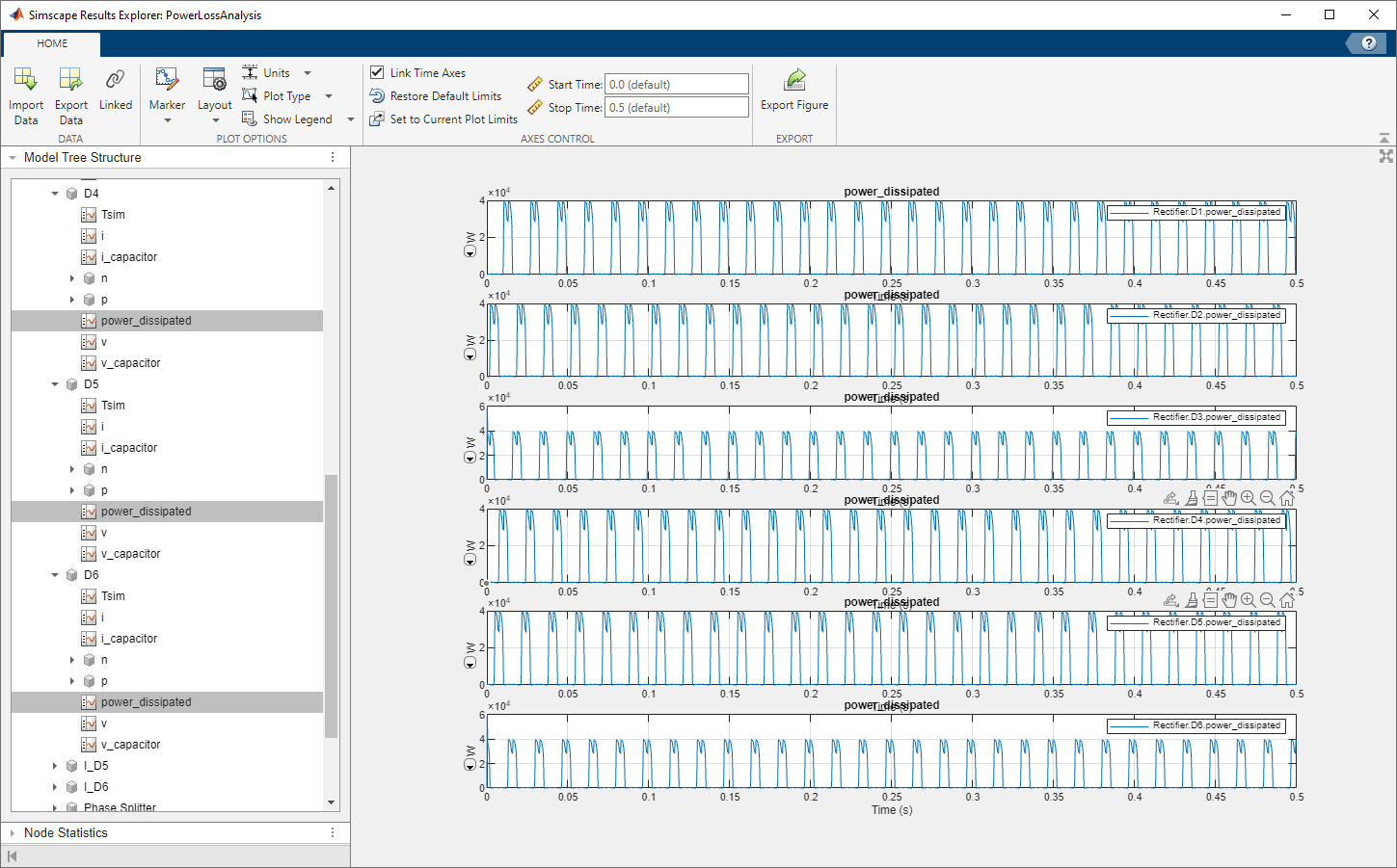 rectifierLosses = 6×2 table LoggingNode Power ________________ ______ {'Rectifier.D3'} 38772 {'Rectifier.D6'} 38772 {'Rectifier.D4'} 293.62 {'Rectifier.D5'} 293.62 {'Rectifier.D1'} 139.11 {'Rectifier.D2'} 31.26The average power dissipated by diodes D3 and D6 exceeds the average for the other diodes.