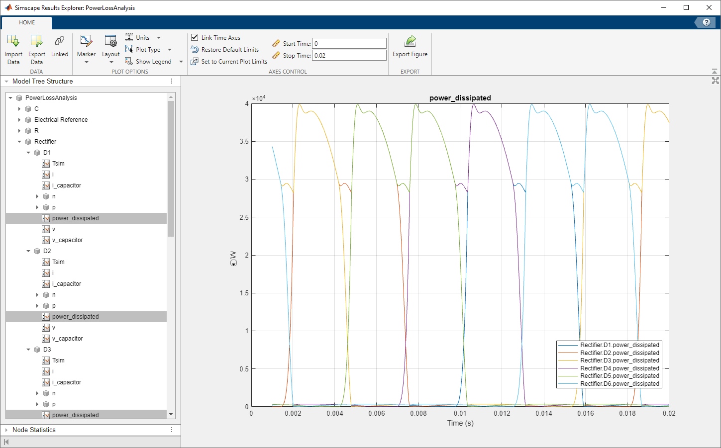 pd_D1_max = max(simlog_PowerLossAnalysis.Rectifier.D1.power_dissipated.series.values); pd_D2_max = max(simlog_PowerLossAnalysis.Rectifier.D2.power_dissipated.series.values); pd_D3_max = max(simlog_PowerLossAnalysis.Rectifier.D3.power_dissipated.series.values); pd_D4_max = max(simlog_PowerLossAnalysis.Rectifier.D4.power_dissipated.series.values); pd_D5_max = max(simlog_PowerLossAnalysis.Rectifier.D5.power_dissipated.series.values); pd_D6_max = max(simlog_PowerLossAnalysis.Rectifier.D6.power_dissipated.series.values); diodes = {'D1';'D2';'D3';'D4';'D5';'D6'}; PowerMax = [pd_D1_max;pd_D2_max;pd_D3_max;pd_D4_max;pd_D5_max;pd_D6_max]; T = table(PowerMax,'RowNames', diodes)T = 6×1 table PowerMax ________ D1 39892 D2 39892 D3 60746 D4 39891 D5 39892 D6 60746The maximum instantaneous power dissipation for diodes D3 and D6 is almost double the maximum instantaneous power dissipation for the other diodes.